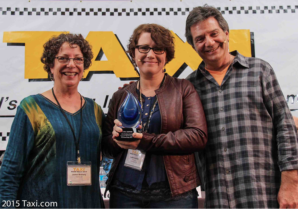 Lydia Ashton (center) is presented with the John Braheny Award while flanked by JoAnn Braheny and Michael Laskow at the 2015 TAXI Road Rally.
